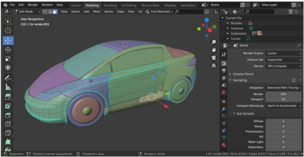 Трехмерные модели деталей автомобиля собирались в сборочные единицы и соединялись в основные части автомобиля. Кузов автомобиля строился в режиме скульптинг. Построение было начато с создания одного полигона, который был разбит на 4 равных полигона. Прибавляя один полигон за другим придавалась форма кузова. В местах, требующих большее количество полигонов, полигоны были поделены на необходимое количество. Построив и отредактировав продольную половину корпуса, был применен модификатор симметрия. Модификатор создает симметричную копию детали. Получившееся деталь меняет свою форму при изменении формы оригинальной детали. Соединив две симметричные части кузова, получился кузов при изменении, формы которого с одной стороны меняется форма другой стороны. Для придания корпусу ровных гладких линий применялись трехмерные лекала. Для построения ровной окружности колесных арок использовался цилиндр. Прикладывая цилиндр к колесной арке как шаблон, выравнивались линии полигонов. Для построения прямых линий на дверях и пороге корпуса использовались прямоугольные плоскости. Трехмерные лекала позволяют проверить прямолинейность линий полигонов со всех сторон. Еще для визуального определения гладкости формы корпуса используются материалы, имеющие глянцевую поверхность. На визуальное определение гладкости поверхности влияют не только тип материала, но также и цвет.
