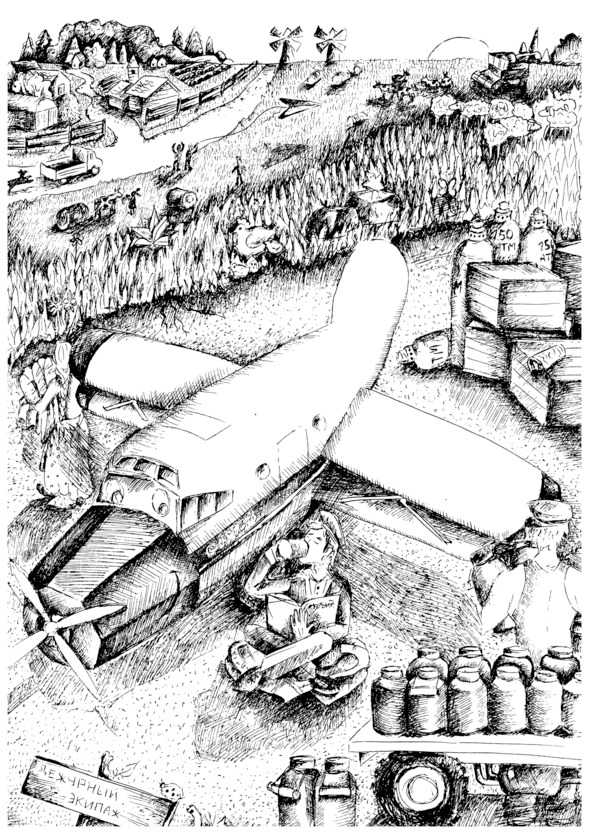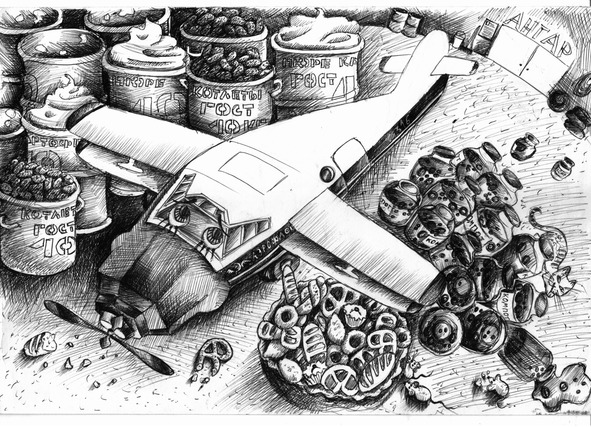 Один самолётик где-то услышал, что человек есть то, что он ест, и подумал, что всё, наверно, оттого, что люди и самолёты едят разную еду. Самолёты ведь что едят? Ан-2, в основном, бензин. Масло ещё. Сжатым углекислым газом любят полакомиться. А люди? И котлeты, и макароны, и кашу всякую! А когда сидят, ждут погоды, то яблоки грызут, семечки щёлкают. Как, например, Гриша, его лётчик. А пьют квас или кефир. Молоко иногда.