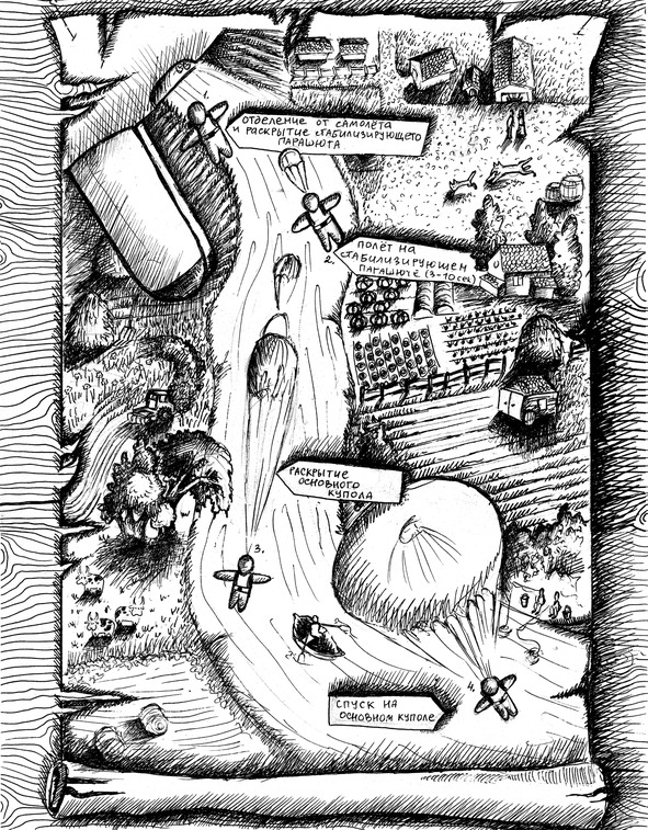 Вошли в зону, легли на курс, установили скорость. Гриша включил в кабине специальный десантный светофор. «Приготовиться» – это жёлтый свет. Командир открыл люк. Можно прыгать. Зелёный – означает «Пошёл».