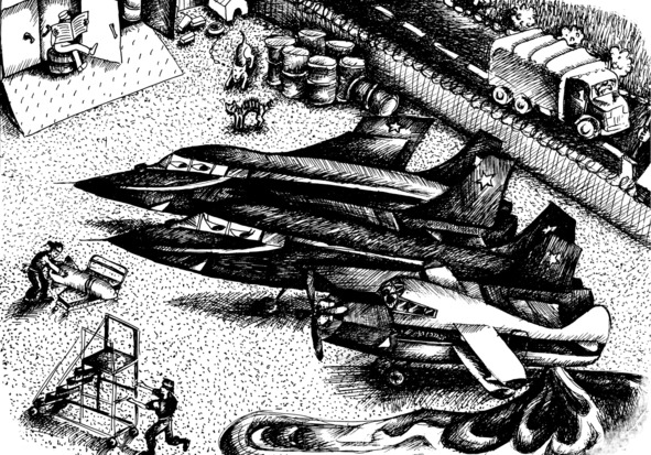 На военном аэродроме Гриша ушёл на их КП, а Вову заправили и дали ему место в строю рядом с большими реактивными самолётами. Это были очень серьёзные военные самолёты. Много они не болтали, боялись, наверное, случайно разгласить какой-нибудь важный секрет. Но, скорее всего, им было не до того: они всё время любовались собой, какие у них замечательные приборы, прицелы, локаторы, пушки, бомбы, ракеты и всякие другие дорогие и красивые штучки. Всю эту красоту им подарили конструкторы и инженеры, что не мешало самолётам хвастаться ими, как своими. Особенно перед маленькими.