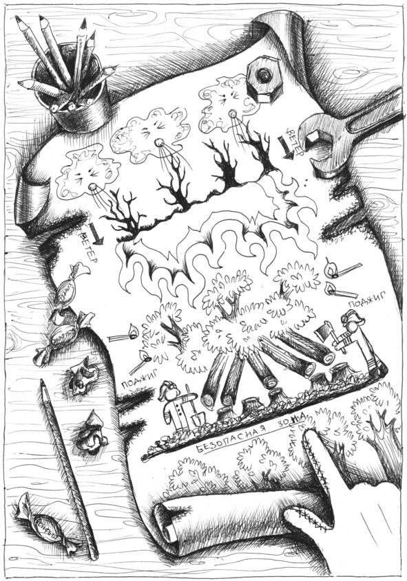 Когда приближающийся пожар втягивает в себя воздух, получается, что ветер дует в другую сторону. Пожарные дождались такого момента и подожгли только что поваленные ими деревья. Теперь им надо было уходить, чтобы самим не сгореть. И тут они увидели, что из леса, спасаясь от огня, выбежала лосиха, а за ней – маленький лосёнок. Звери очень боятся огня. Это человек, тем более пожарный-профессионал, может перешагнуть через горящую траву или пройти между горящими деревьями. А зверь, даже очень смелый, – нет. Выбежали бы лоси хоть на пять минут раньше, они бы успели убежать. Но навстречу им уже шёл другой огонь, тот самый встречный пал, который пустили пожарные.