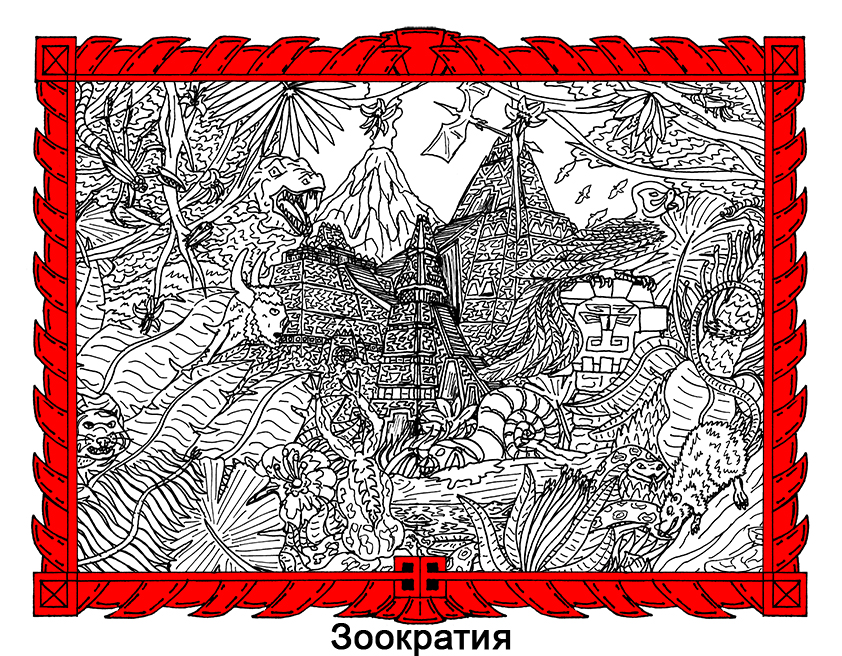Жрецы и воины аккуратно и тщательно обыскали развалины, ведь дремучие леса Зоократии смертельно опасны даже для зооантропоморфов. Дикая природа джунглей, живущая по законам охотника и жертвы, порождает невероятно больших и опасных хищников. Стоило чуть углубиться в лес, как можно было навсегда в нем и остаться. На каждом шагу человек или зверолюд мог стать едой гигантских аллигаторов, анаконд или варанов, от могучих саблезубых пантер и ягуаров невозможно было убежать. Трехметровый адский боров – эдакий скалоподобный плотоядный кабан с мордой, покрытой рогами и шипами, – невероятных размеров сумчатый волк, комары и шершни с человеческий рост – и это далеко не полный перечень ужасных хищников языческих лесов, одинаково беспощадных как к самим язычникам, так и к иноверцам. Так что даже у многочисленной и вооруженной до зубов процессии были все основания опасаться размещаться в руинах, пока не станет ясно, что там не поселилась какая-нибудь зверушка или не выросло массивное плотоядное растение.