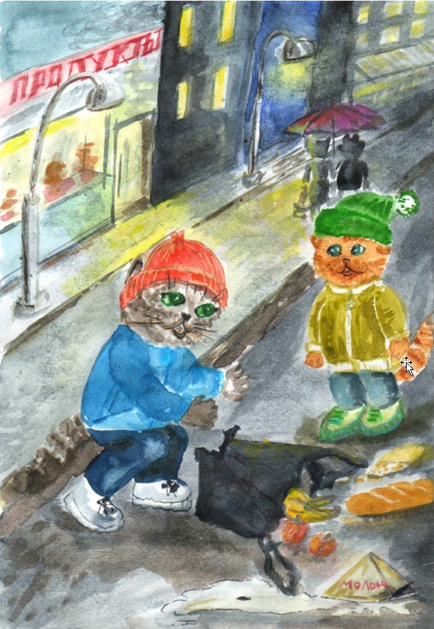 Пока шли они обсуждали, как получилось так, что никто из прохожих Васятке не предложил свою помощь, когда у него порвался пакет. И друзья решили, если кто-то окажется в беде, котики вместе придут на помощь.
