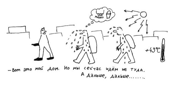 После плотного завтрака нам стало тяжело и жарко ходить. Почему-то на горизонте очень быстро, ровно и не пыля, проползали миражи машин, и мы решили, что там идёт асфальтовая дорога, хотя это и невозможно. Пока шли туда, вспомнили, что забыли набрать воды. Поскольку там, где изредка проползали машины, домов (и, соответственно, воды) не ожидалось, я оставил Гришу на возвышенном месте и вернулся в деревню, где зашёл в какой-то двор и напугал до истерики ребёнка лет пяти, который с рёвом и скоростью ракеты убежал в женскую половину дома. Женщины, вышедшие во двор, наполнили мне канистру, приняв меня, наверное, за водителя машины, у которой закипел мотор.