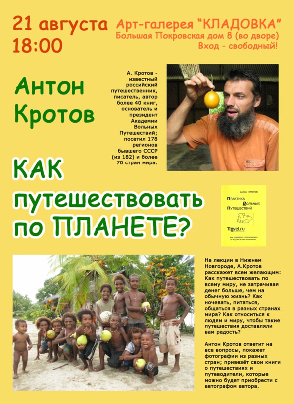 Антон КРОТОВ (г. Москва) – путешественник и писатель, предолевший более 500.000 километров автостопом и пешком по России, СНГ, Евразии, Африке; автор 30 книг; Президент Академии Вольных Путешествий, и