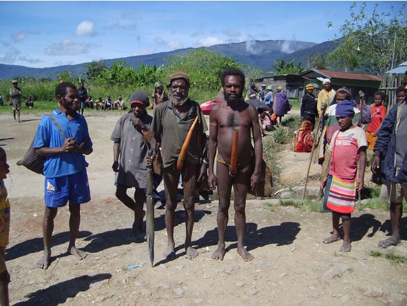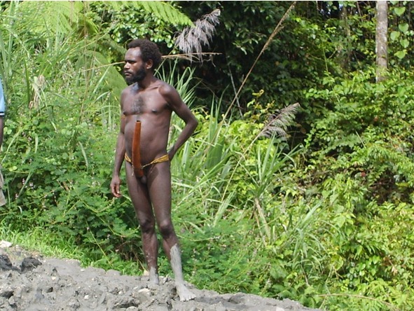 Я, очень довольный приятностью ПНГ, стал осматриваться. Вокруг были многочисленные аккуратные хижины, прямоугольные в плане, из досок, стоящие на деревянных ножках, с треугольной крышей «домиком», крыша была покрыта соломой. Признаков электричества не было. Обитатели, чёрные лицом, подобные неграм, сидели у входов в своих избушки, глазели на меня, но активных действий не предпринимали. Мужчины были одеты в разные б.у. шорты и штаны, а некоторые – вообще нормально одеты, только обуви не было у большинства людей. Женщины были тоже одеты обычным образом, в международную / европейскую / китайскую одежду. Дети были одеты в разные шорты, мелкие были голышом. Огородов не было видно в деревне. Иногда пробегали курицы или свиньи. Признаков дистрофии и голода никто не проявлял. Особый интерес к иностранцу тоже никто не проявил – не старались ни попрошайничать, ни разглядывать, ни ю-ю-кать, как эфиопы. Вежливо поглядывали меня, но не скапливались толпою. Всего в деревне обитало, на вид, много сотен человек.