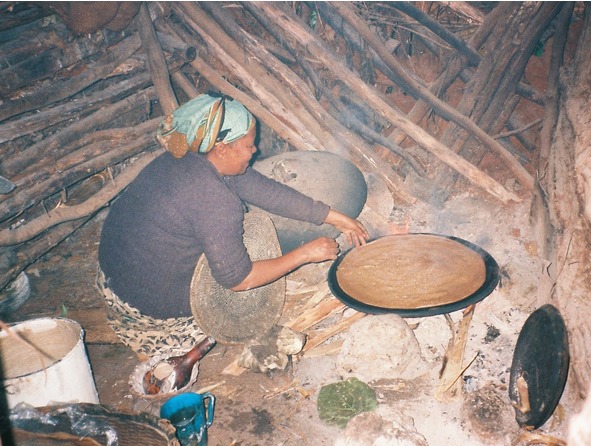 Мы сидели и пили молоко в хижине, поросшей зелёным плющом, там, где купили шесть хлебов, и ожидали наших отставших на реке друзей. Хозяйка-эфиопка решили порадовать нас и оперативно испекла блин-инжеру, намазав его перцем, чтобы мы его съели не слишком быстро. Тут подошли Сенов, Грил и Лекай. Сергей Лекай был у нас самый любитель перца, так как после его путешествий по Китаю и Тибету любой самый острый красный маленький перчик был для него не острее варёной морковки. Вот он и оценил инжеру вместе с О. Сеновым. А Гриша Лапшин, как оказалось, на дух не переносил перца, и его порция – кусочек инжеры – досталась счастливому гиду. На прощанье хозяйка угостила нас кофе, который сварила при нас, но его оказалось так мало (не более десяти грамм на человека), что я не сумел даже распробовать вкус его. Эфиопы рады были бы угостить нас и ещё чем-либо, но было нечем.