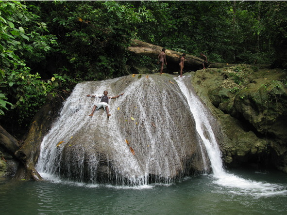 Наконец мы пришли к водопаду (высотой несколько метров) и искупались в нём, плавали в озерце, образованном под водопадом, а вокруг была тропическая зелень. Было очень интересно. Папуасы хотели, чтобы я плавал с ними наперегонки, я конечно же отставал, к большому удовольствию ребят. Размеры озера были игрушечные, метров пятнадцать, так что утонуть нельзя было. Я вообще человек не водянистый, и поэтому когда мне предложили съехать тоже по водопаду в озеро, испугался, но всё же съехал и набрал полные уши воды, потом отплёвывался, а папуасы смеялись весело. Райские места! Даже комаров почти нет.