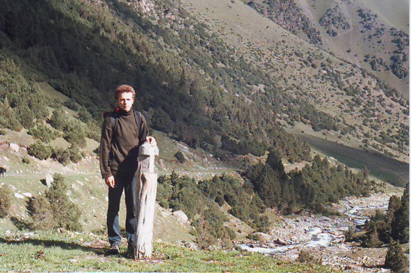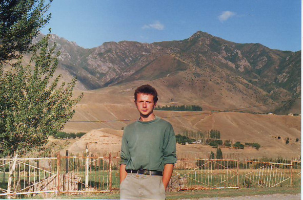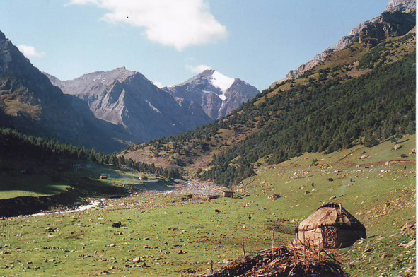 До конца города выбрались на маршрутке, и автостопом на 2-х машинах достигли селения Лянгар. Перешли вброд реку (она была мелкая и мутная) и оказались на горной дорожке, ведущей вверх. Вокруг были холмистые горы, покрытые жёлтой и зелёной травой. Обитатели жили в домах и юртах. Когда пошёл дождь, мы спрятались в один дом. Хозяйка подарила нам целый пакет сыра, сделанного в виде шариков. До этого мне очень нравился этот сыр, а после этого случая я его объелся и долго не употреблял. Когда кончился дождь, мы пошли дальше. Зашли в одну из юрт, нас накормили чаем, лепёшками, маслом и кумысом, всё почти как в Монголии.