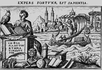 Петрарка достаточно взвешенно и осторожно призывал не слишком радоваться счастливым поворотам судьбы и не очень горевать о несчастных: «мы ведем с судьбой сразу две войны: одну – против враждебной фортуны, другую – за счастливую; шансы и на победу и на поражение равны… Я полагаю, что труднее управлять счастливой судьбой, чем несчастной… Я видел многих, которые равнодушно относились к потерям, бедности, изгнанию, тюрьме, казни, смерти и к тому, что хуже смерти, – тяжким болезням. Я видел и тех, кто равнодушен к богатству, почестям, власти. И по моим наблюдениям, часто тех, кого не могла победить никакая жестокость неблагоприятной судьбы, играючи сваливала счастливая… Опасен лик всякой судьбы – и благоприятной, и неблагоприятной. Но уметь перенести надо и ту, и другую судьбу; одна нуждается в укрощении, другая – в утешении…»[32] Начало же Нового времени было в этом отношении несколько радикальнее. Весьма показательна здесь эмблема из сборника Жан Жака Боссарда 1595 г. На переднем плане на ней представлена стоящая за кафедрой женщина, погруженная в изучение некоего фолианта, рядом с ней, на другой книге, покоящейся на подставке, восседает сова, символ мудрости. Греческая надпись на кафедре – стих, позаимствованный у Менандра, гласит: «Обладание мудростью почтенней богатства». На заднем плане представлена барка Фортуны, плывущая по бурной реке, но женщина за кафедрой даже не удостаивает ее внимания. Латинский девиз эмблемы: «Expers Fortuna est sapientia» (Мудрость не подвержена превратностям Фортуны). Петрарка призывал примириться с любыми поворотами судьбы – Боссард же настаивает на том, что превратности судьбы надо попросту игнорировать, вовсе не обращая на них внимание. Заметим, что эта эмблема замыкает его сборник – и тем самым ей придается особое, итожащее значение.
