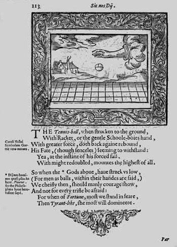 The tennis-ball, when srucken to the ground,With Racket, or the gentle School-boies hand,With greater force, does back againe rebound,His Fate, (though senceles) seeming to withstand…So when the Gods aboue, haue struck us low,(For men as balls, within their handes are said),We chiefly then, should manly courage show,And not for every triftle be afraid:For when of Fortune, most we stand in feare,Then Tyrant-like, the most will domineere.[35][Теннисный мячик, когда его бьют о землю/ Ракеткой, или слабой рукой школьника,/ Отскакивает обратно с большей силой,/ Его судьба (пусть он – бесчувственен при этом) – выстоять…// Точно так же, когда Боги наверху наносят удар, и мы летим вниз/ (Ибо, говорят, что люди подобны мячикам в их руках),/ Мы, прежде всего, должны проявить отвагу/ А не пугаться каждой малости:/ Ибо, чем больше из-за <прихотей>Фортуны мы пребываем в страхе,/ При том, что она подобна Тирану, тем больше она берет <над нами>вверх.]