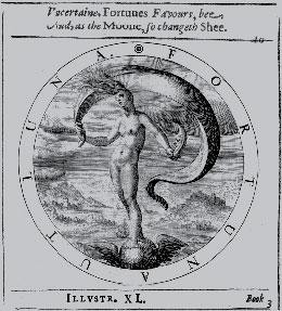 И все-таки, постепенно, с середины XVII в. Фортуна «сдает свои позиции» – изображений становится все меньше. Да, ее упоминают в текстах, но эти упоминания – уже просто языковые клише, а не живые метафоры. Для Англии особую роль тут сыграл период Гражданской войны и протектората Кромвеля, когда все сферы жизни испытали сильнейшее влияние пуританизма… Внес свою лепту в процесс «дискредитации Фортуны» и рационализм эпохи Просвещения. Но память о своенравной богине осталась в подсознании культуры – чтобы всплывать вновь и вновь самым неожиданным образом. Так, броское название романа Нортопа Фрая «Теннисные мячики небес», позаимствованное автором у современника Шекспира, драматурга Джона Уэбстера, чьи строки «We are merely the stars' tennis-balls, struck and banded/ Which way please them…» (Мы – теннисные мячики небес, Они соединяют нас и лупят,/ Как захотят. – Пер. С. Ильина) из пьесы «Герцогиня Мальфи» стали эпиграфом к роману – восходит к расхожему, в первой половине XVII в., представлению о человеке как игралище Фортуны. В сборнике Генри Пичама «Minerva Britanna», вышедшего за год до драмы Уэбстера, в 1612 г., одна из эмблем изображает протянувшуюся из-за облаков руку Провидения, роняющую теннисный мячик, а пояснительный текст гласит: