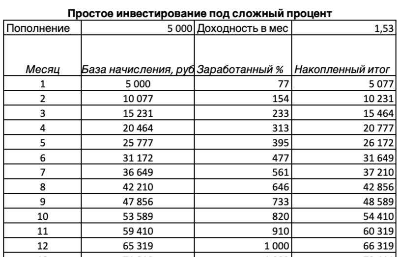 К концу года у вас уже скопится неплохая сумма на новенький iPhone, неплохо, а? Но интереснее здесь другое. Обратите внимание на столбец «Заработанный %». Уже на 11-й месяц вам «накапает» 5319 рублей (сложите значения с 1-го по 11-й месяц), которые заработали не вы своим потом и кровью, а ваши собственные деньги!