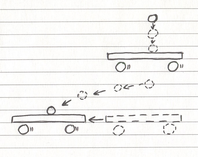 Один из примеров принципа относительности Галилея. Наблюдатель в вагоне видит отвесное падение камня. Внешний наблюдатель видит падение камня по параболе. Оба наблюдатели увидят одинаковую скорость падения камня по вертикали, но разные горизонтальные скорости и траектории