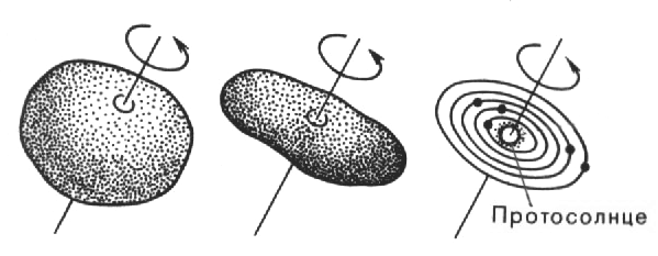 Вернемся на пять миллиардов лет назад и посмотрим, что же происходило с вращающейся шаровой туманностью. Правда, в отличие от горячей туманности Канта и Лапласа, наша туманность холодная. При вращении она постепенно сплющивалась и превращалась в диск с шарообразным утолщением в центре.