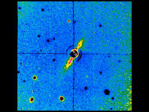 Не менее эффектно смотрится горячий пылевой диск у Беты Живописца. На изображении, полученном «Хабблом», была не только показана внутренняя область пылевого диска диаметром 320 миллиардов километров, окружающего звезду, но и обнаружены признаки массивной планеты, гравитация которой стягивает часть пыли на себя.