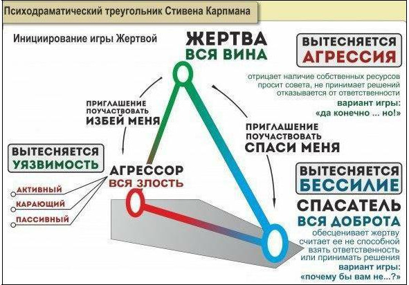 Например, отказываясь принимать ответственность, мы попадаем в позицию Жертвы. А пытаясь помочь человеку против его воли – в позицию Спасателя. Из нее потом почти неизбежно вылетаем в роль Агрессора, так как спасаемый по своей природе часто спасаться не хочет, чем вызывает гнев, раздражение и преследование.