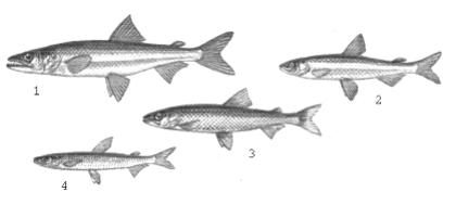 Рис. 1. Корюшки: 1 – Азиатская корюшка; 2 – Малоротая корюшка; 3 – Европейская корюшка; 4 – Озерная корюшка (снеток).