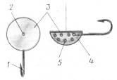 Рис. 2. Блесенка для корюшки: 1 – крючок; 2 – отверстие для лески; 3 – медная пластина; 4 – припой; 5 – светящиеся глазки.