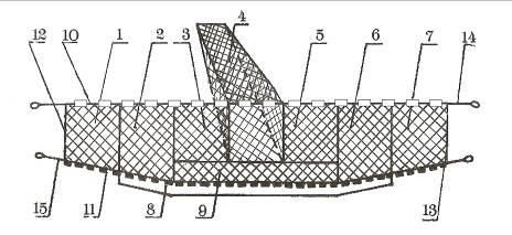 Рис. 8. Бредень и его составные части: 1 – правое крыло (2 часть); 2 – правое крыло (1 часть), 3 – правый привод; 4 – мотня; 5 – левый привод; 6 – левое крыло (2 часть); 7 – левое крыло (1 часть); 8 – подзор; 9 – сорочка; 10 – верхняя подбора; 12 – правый кляч; 13 – левый кляч; 14 – верхняя чалка; 15 – нижняя чалка.