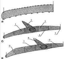 Рис. 12. Различные виды бредней – без мотни (а), равнокрылый (б) и неравнокрылый (в): 1, 3 – крылья равнокрылого бредня, 2, 8 – мотня, 4 – грузовой шнур; 5 – кляч; 6,7 – бежное крыло; 9 – пятное крыло.