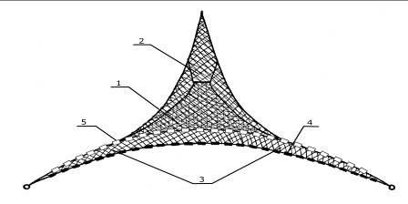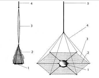 Рис. 15 Подъемник-«зонтик» конструкции В. Золотарева: 1 – медная шайба диаметром 40 мм; 2 – спицы длиной 480 мм из проволоки диаметром 5 мм, подвижно соединенные с шайбой; 3 – леска, соединяющая концы спиц; 4 – стропы; 5 – тяговый шнур.