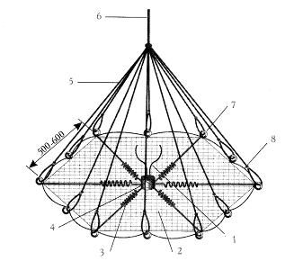 Рис. 16. Подъемник-«зонтик» конструкции Д. Звягинцева: 1 – проволочки для привязывания приманки; 2 – сетное мелкоячеистое полотно; 3 – пружинные распорки; 4 – свинцовый груз весом 100 г; 5 – стропы; 6 – тяговый шнур, 7 – кольца, 8 – боковая нить.
