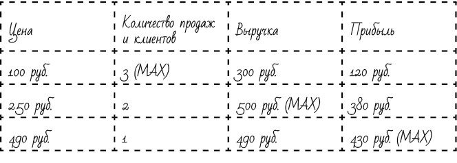 • Если цена составит от 60 до 100 руб., будет продано три бутыли, все клиенты будут счастливы, включая и пенсионера, и бизнесмена. Ведь очевидно, что 100 руб. лучше, чем 60. Поэтому зафиксируем первую точку – 100 руб. При такой цене будет продано три бутыли, выручка составит 300 руб., себестоимость трех бутылей – 180 руб., а значит, прибыль – 120 руб.