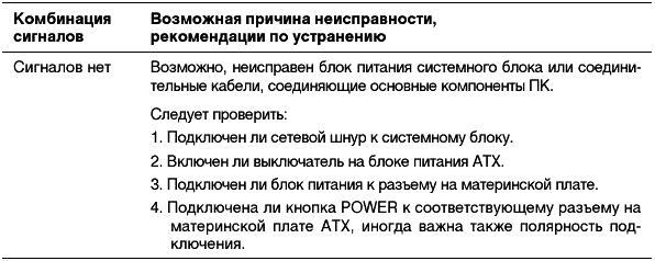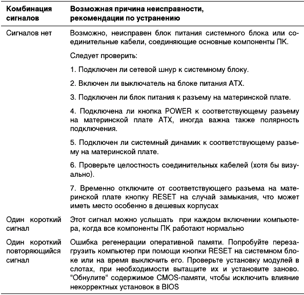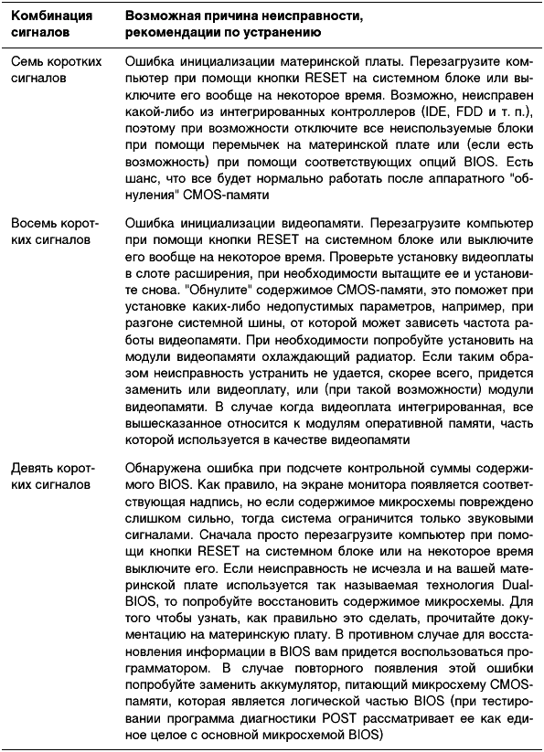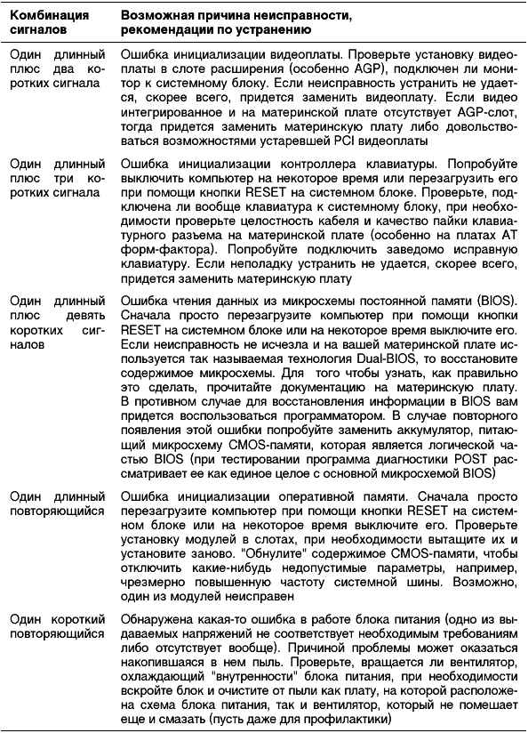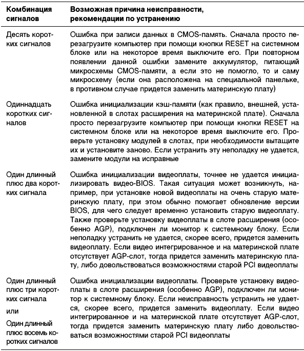 Таблица 2.1. Диагностические сигналы, характерные для большинства версий AWARD BIOS