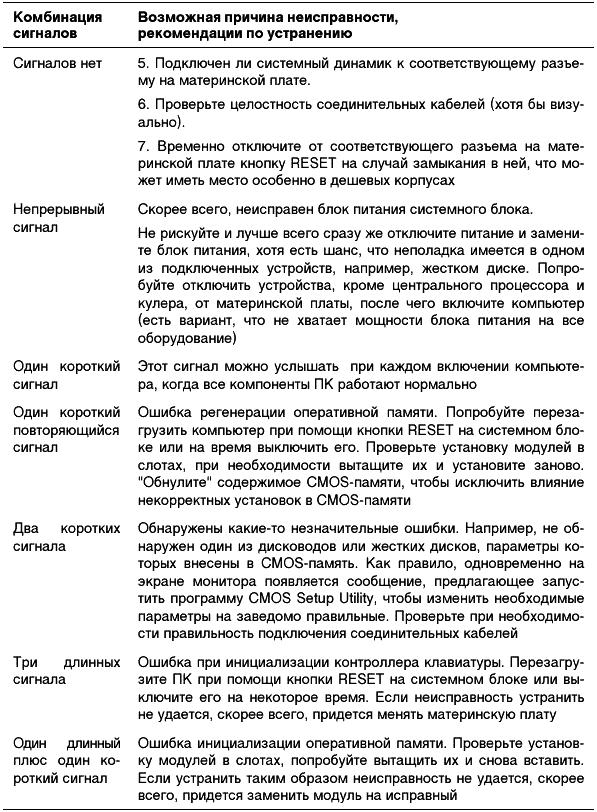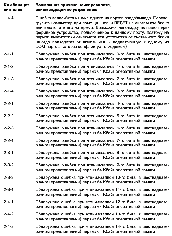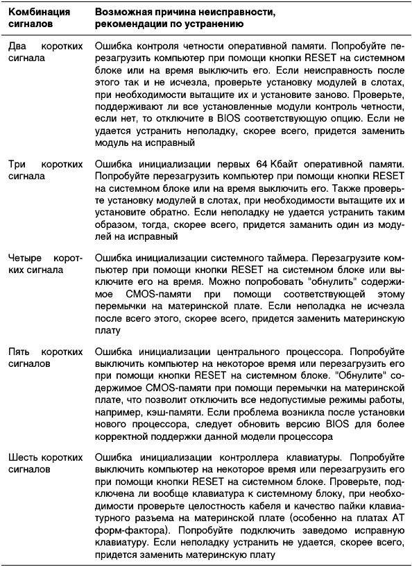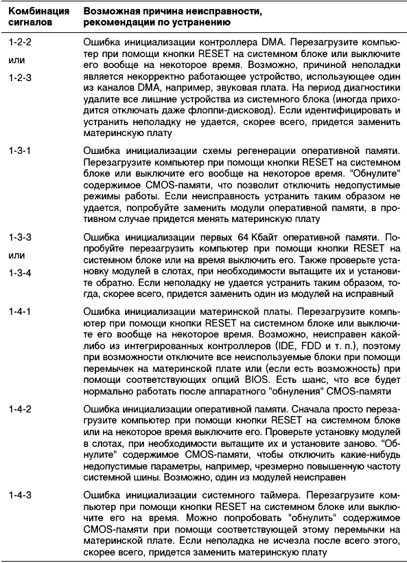 На сегодняшний день сложно представить ситуацию, когда вам встретится «чистая» версия Phoenix BIOS. Довольно давно в микросхемы с этим логотипом «зашивается» AWARD BIOS версии 6.0, что является показателем того, что эти две компании уже слились воедино. Хотя такой шанс все-таки есть, например, при покупке ноутбука, бывшего в употреблении, т. е. выпущенного пару лет назад. Комбинации звуковых сигналов, которые в этом случае можете услышать, могут привести в ужас опытного специалиста по ремонту компьютеров, т. к. придется очень внимательно слушать и считать, сколько именно раз пропищал системный динамик (табл. 2.3).