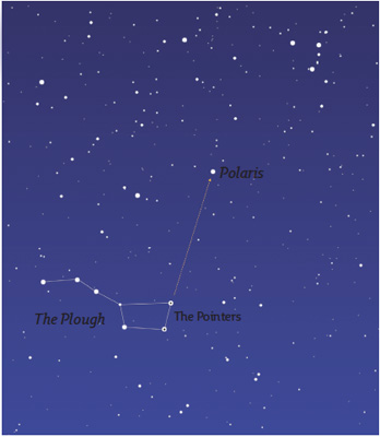 You can always find Polaris by using the two right-hand stars of the Plough, which are called the Pointers. No need for Sherlock Holmes here – these two stars, Dubhe and Merak, simply ‘point’ up out of the ‘saucepan’ to Polaris. Elementary. And this is just one reason why the Plough is so useful. Through this book you’ll find plenty of ways that it can be used as a ‘signpost’ to many other stars and constellations.