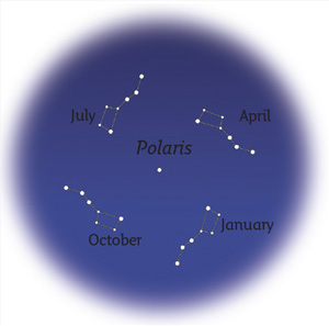 As you may have noticed, there is a well-known star ‘locked’ in the centre of the image that the Plough rotates around. This is Polaris, also known as the North Star, or indeed the Pole Star. This last name means that it is the closest star to the North (Celestial) Pole, but because of the way the Earth spins on its axis, this is a temporary title and has been held over millennia by a number of the stars featured in this book.