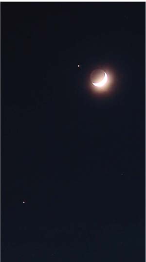 Thing Approximate angular size Distance from the Pointers in the Plough to Polaris 28° Length of the Plough 24° Your outstretched hand at arm’s length (roughly) 22° Distance apart of the Crux Pointers 6° Distance apart of the Pointers in the Plough 5° Your forefinger at arm’s length 1° Your little finger at arm’s length ½° The Sun ½° The Moon ½° Distance of Ganymede from Jupiter (that’s the brightest of the planet’s main Moons) 6’ Resolution of the unaided eye (this means your eye can see two objects that are very close together as two objects rather than one.) 3’ 25” Maximum size of Venus 1’ Biggest crater on the Moon 1’ Your eye can see single objects as small as… (about) 1’What’s interesting from this table is that technically we can see at least one of the moons of Jupiter as well as the crescent-shape phase of Venus simply by gazing skyward with our unaided eyes (the 20–20 variety is required). However, in practice the usually super-brightness of Jupiter drowns out the fainter light from its moons, while the dazzling appearance of Venus does the same for its crescent.