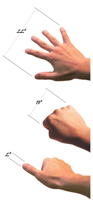 Look! You can use many bits of your hand to measure different sizes in the sky.