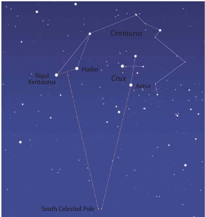 Crux, and some friends that we shall meet very shortly, are the southern equivalent of the Plough and Pole Star combined, because they too can be used to find your way about in the dark. By following various imaginary lines you can fairly easily discover the South Pole of the sky – the point about which the stars seem to revolve.