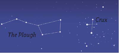 A comparison in size between the Plough, a part of Ursa Major, and Crux, the Southern Cross.