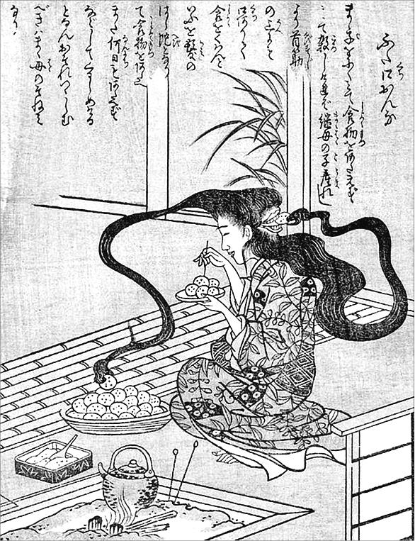 Широко известна сказка о старом скупердяе, не желавшем жениться, так как совместная жизнь предполагает некоторые расходы. Однажды ему удалось встретить девушку своей мечты, которая не ела совсем (или, может быть, ела допустимо маленькие порции), а работала, как и подобает японской крестьянке. Вскоре, однако, выяснилось, что запасы риса тают, как снег под солнцем. Неугомонный старик устроил слежку и обнаружил, что волосы на затылке скрывают чудовищный рот, который поглощает огромное количество пищи. Пряди волос попутно исполняют хватательные функции.
