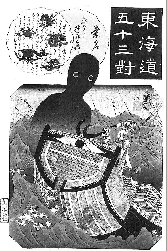 Самурай по имени Таро Мицукуни смотрит прямо в глазницы нежданного гостя и выхватывает меч из ножен. Очевидно, бегства и криков не будет, и, вполне возможно, О Докуро не соберет своих гигантских костей, хотя выглядит он весьма внушительно. Невольно вспоминается гравюра с изображением уми-бозу, принадлежащая кисти того же мастера. Морской ёкай навис над кораблем, но самурай, стоящий на палубе, уже схватил увесистый якорь и готов поприветствовать чудище. Можно сказать, что размер не так уж и важен.