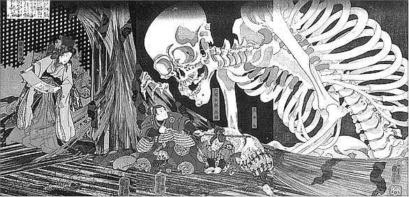 Возвращаясь к О Докуро, можно вспомнить наиболее любопытные примеры его появления в японской истории. Вышеупомянутая гравюра Утагавы Куниёси намекает на историю из далекого прошлого, связанную с неким Тайра-но Масакадо. Его бурная биография не относится к данной теме, но, говоря коротко, мятежником он был выдающимся. Начав с убийства своего дяди, он продолжил успешную междоусобную войну в восточных провинциях и закончил жестом совершенно небывалым, объявив себя императором. Ни до него, ни после никто из японских полководцев и мятежников не додумался до такого. Враги Масакадо объединились, и война продолжилась. Ее финалом стала смерть Масакадо, отсечение его головы и последующая ее демонстрация в Киото. Мертвый Тайра-но Масакадо успешно вписал себя в историю мистической Японии. Его голову видели летающей над городом, строящей гримасы и издававшей злобный хохот. Его дочь, затаившая злобу на победителей ее отца, занялась колдовством. Ее безграничная ярость и навыки в чародействе способствовали появлению О Докуро. Данный момент и послужил темой для произведения Утагавы Куниёси.
