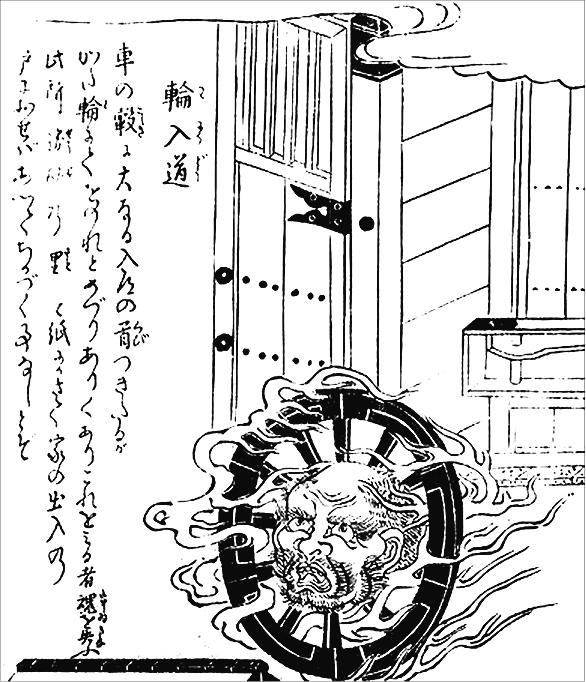 Над городами и деревнями стало появляться бешено вращающееся колесо повозки, объятое пламенем. В его центре место втулки занимает лицо покойного дайме, искаженное нечеловеческой яростью!