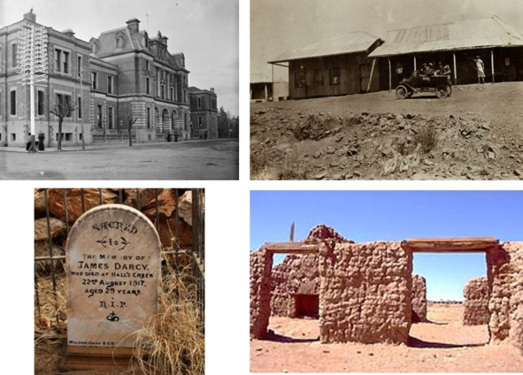 Правительственное здание г. Перт, в котором помещалась телеграфная станция (дата съемки 1900—1910 гг.), Холлс-Крик (дата съемки 1914 г.), фотографии State Library of Western Australia; могила Джима Дарси; руины почтовой станции, где состоялась знаменитая телеграфная консультация и операция (г. Холлс-Крик, Австралия)