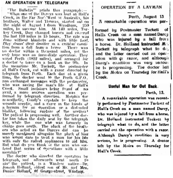 Такетт телеграфирует в город Перт, столицу штата, где практикует доктор Холланд. Около 9 вечера 31 июля доктор отвечает на вызов, расспрашивает о симптомах, впрочем, картина очевидна – уже более 60 часов у Дарси нет мочи, боль невыносима. Нужна операция, но Такетт вовсе не хирург. Следует драматичный диалог «морзянкой»: