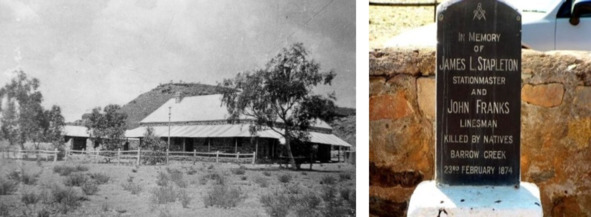Телеграфная станция Барроу-Крик (фотография начала 1920-х гг.). Надгробье погибших сотрудников станции James L. Stapleton и John Franks (современный вид)15