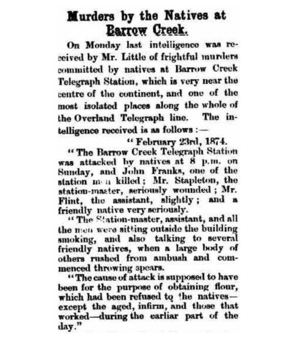 Заметка из газеты «Northern Territory Times and Gazette» от 27.02.1874. с описанием происшествия на телеграфной станции Барроу-Крик (впервые опубликовано Robert H. Eikelboom)16