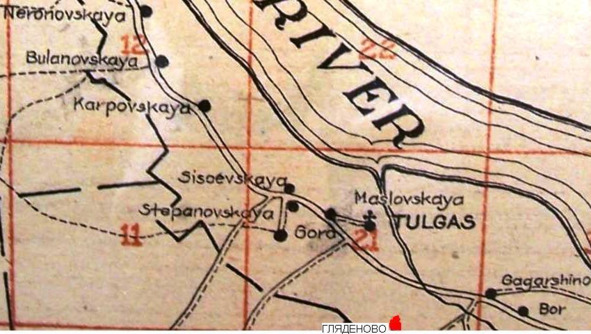 На карте нет деревни Гляденово (Дмитриевская). Видимо, ко времени составления карты деревня была уже сожжена. Обозначена мною.