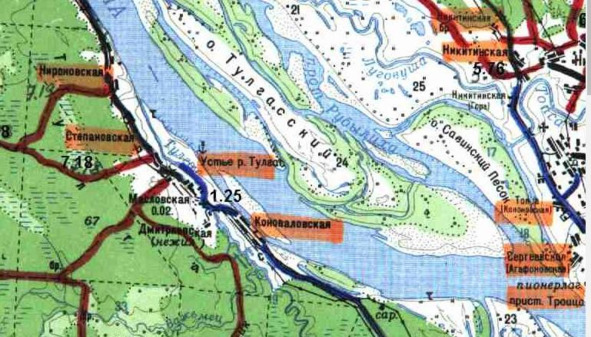 Сравните две карты и обратите внимание на изменение берега Двины за прошедшие годы. В Коноваловской (Гагаршине) его отмыло до деревенской улицы. Пристань т/х «Заря» была напротив Масловской (Лёвичи) и называлась «Устье реки Тулгас», но сейчас устье реки сместилось до деревни Карповской (Транчихи).