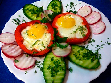Выкладываем глазунью на тарелку, делаем нарезку овощей и добавляем зелень. Вкусная полезная глазунья на завтрак готова.