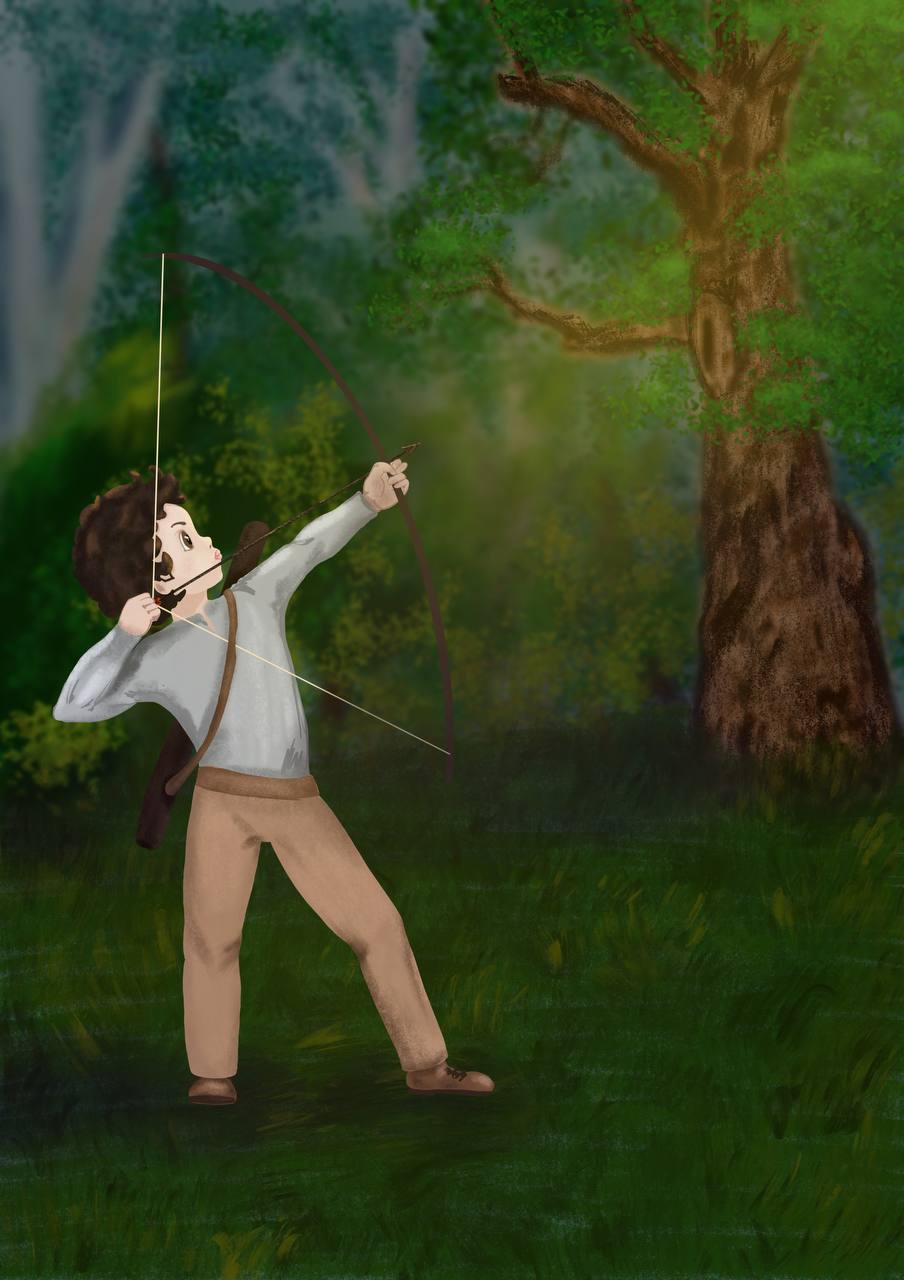 «Все. Последняя серия» – подумал он и взял седьмую стрелу. Именно она была в дупле и в небе. Она отличалась цветом оперения. Она была с красными перьями. И она ушла в полет. Мимо корзины, мимо ствола, мимо всего. Унылый взгляд скользил по краю леса. Потом он поднял с земли палку и воткнул ее на место, откуда стрелял.
