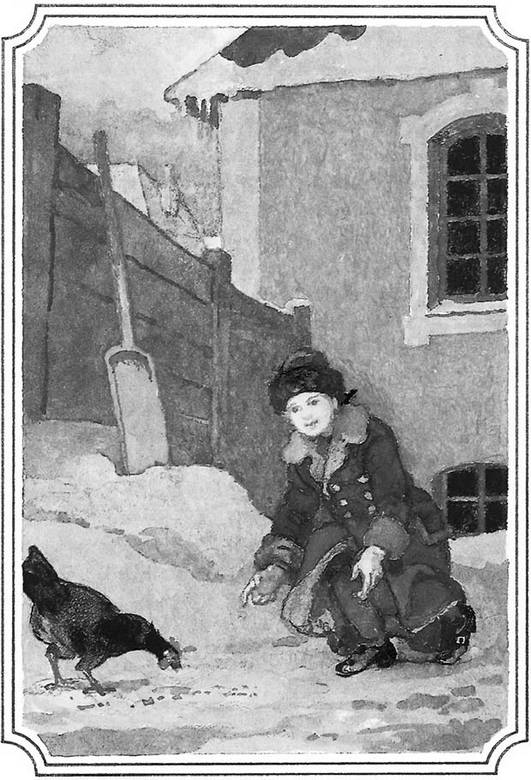 Другое занятие Алеши состояло в том, чтобы кормить курочек, которые жили около забора в нарочно для них выстроенном домике и целый день играли и бегали на дворе. Алеша очень коротко с ними познакомился, всех знал по имени, разнимал их драки, а забияк наказывал тем, что иногда несколько дней сряду не давал им ничего от крошек, которые всегда после обеда и ужина он собирал со скатерти. Между курами он особенно любил черную хохлатую, названную Чернушкою. Чернушка была к нему ласковее других; она даже иногда позволяла себя гладить, и поэтому Алеша лучшие кусочки приносил ей. Она была нрава тихого; редко прохаживалась с другими и, казалось, любила Алешу более, нежели подруг своих.