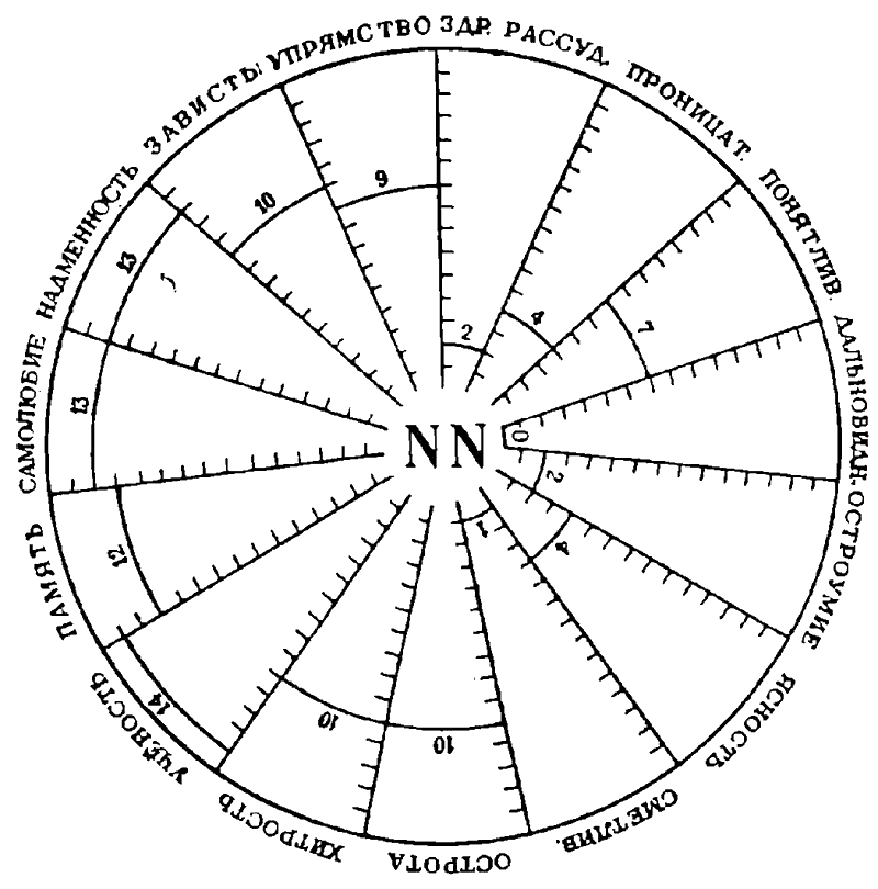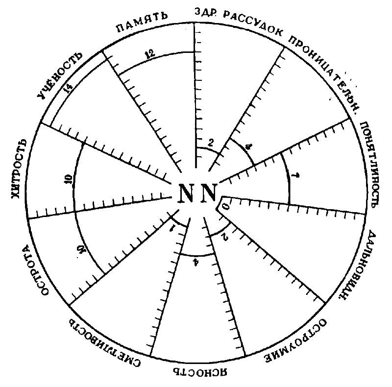 Итак, взглянув на фигуру эту, можете вы вдруг обозреть, из чего составляется ум N. N. Вы видите, что он человек чрезвычайно ученый и что первенствующий в нем род ума есть память, за которою следуют острота, хитрость и так далее. Приведите все роды в порядок по числу градусов, и выйдет следующее заключение: N. N. с чрезвычайною ученостию соединяет необыкновенную память, имеет весьма много остроты и хитрости и довольно понятливости; нет у него также недостатка в некотором количестве проницательности и ясности; но зато остроумия и здравого рассудка очень мало, сметливости и того меньше, дальновидности совсем нет, а глубокомыслия и не ищите.